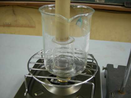 大きいビーカーの中に小さいビーカーをうつ伏せにして沸騰した時に出る泡を集めました。小さなビーカーいっぱいに泡が集まると火を止めて観察します。しばらくすると泡が無くなって水に満たされました。何度しても同じです。