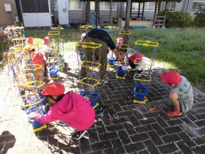 支柱からつるをはずして、思い思いに丸く形をつくりました。しばらく学校に置いておき、お家に持ち帰る予定です。