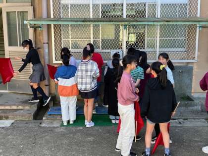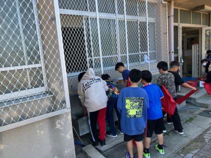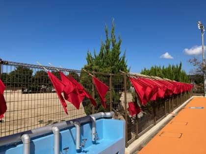 運動会で使用したフラッグを学年全員で洗いました。練習の土や汗で汚れていたフラッグもきれいになりました。