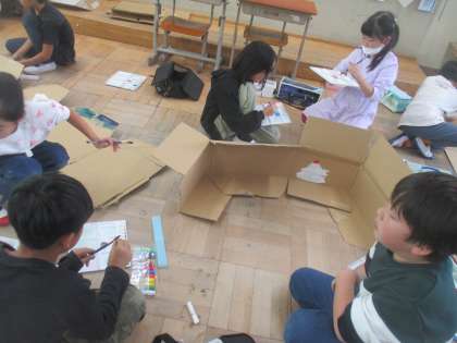 ダンボール箱を開いたり、立てたりしながら、思いついたことを友だちと協力してあらわしていました。とても楽しそうに活動していました。