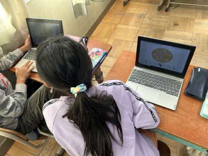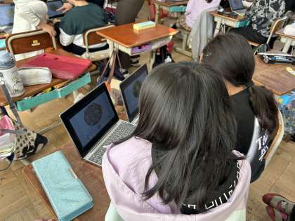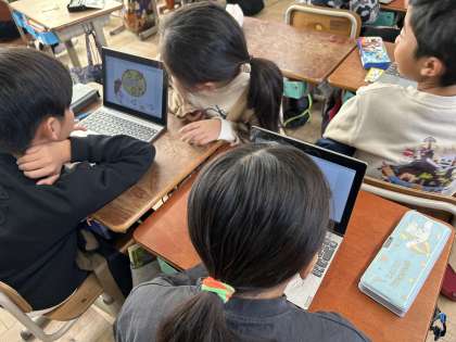 友だちにほしいピザの具材を"What do you want?"の表現を使ってたずねていました。タブレットを使って実際にピザを作っていました!