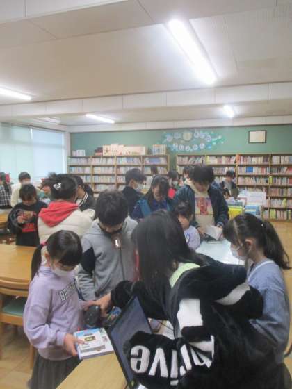 朝会の後に約束したペアが、図書館で待ち合わせ。6年生と1年生がいっしょに本を探しました。お目当ての本を見つけて、いっしょに借りに行ってました。