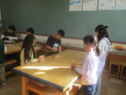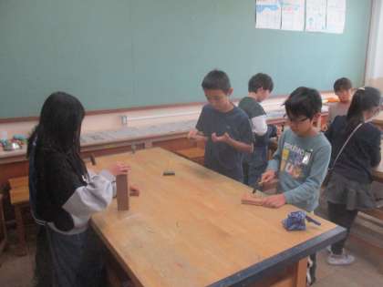 図工室でくぎ打ちをしていました。手を打たないか、ドキドキしながら学習していました。