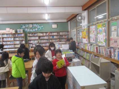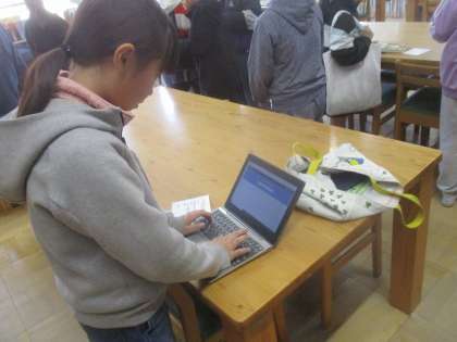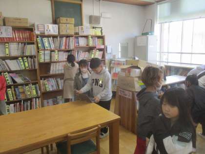 たてわり読書の様子です。3年生の興味がある言葉をつかって、4年生がカーリルで本を探してくれました。