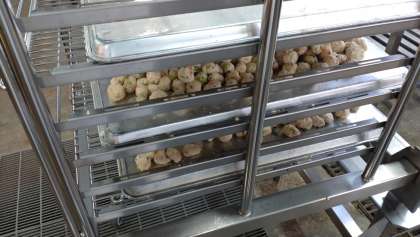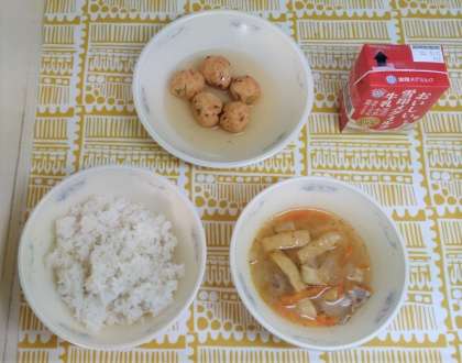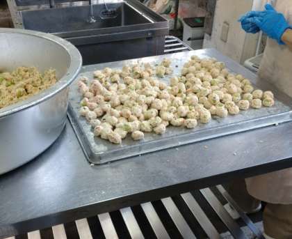 今日のがんもどきのあんかけのがんもどきはとうふ・おからパウダー・鶏ひき肉・枝豆・干ししいたけ・にんじん・米粉を混ぜ合わせて作ったたねを調理員さんが一つずつ丸めてから油で揚げています。
