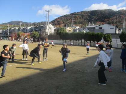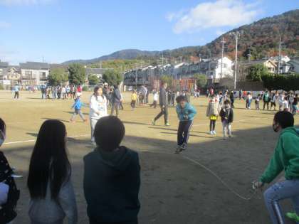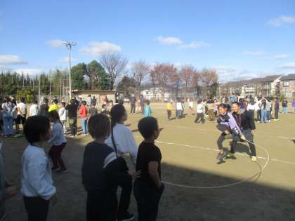 昨日の中間休み、大縄大会が行われました。クラスみんなで声をかけ合い、励まし合いながら、がんばっていました。