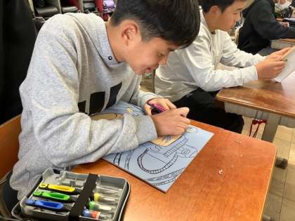 図画工作の版画が完成に近づいてきました。丁寧に彫ったり刷ったりする姿が目立ちました。
