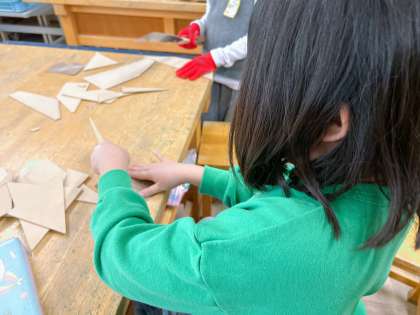 ギコギコトントンクリエイターの学習が進み,のこぎりの使い方にも慣れてきた様子です。早い子は紙やすりでこすったり,絵の具で色を付けたり,工夫しながら進めていました♪