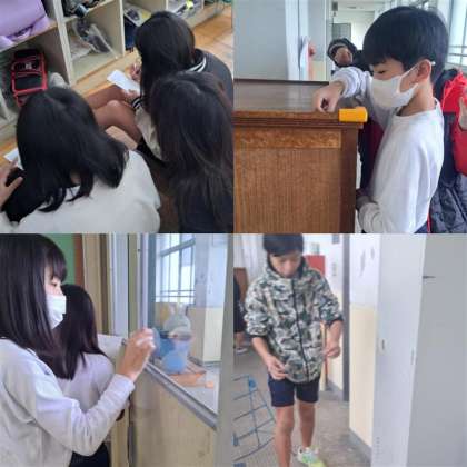 学校で汚れているところ探しをしました。普段のそうじで行き届いていない場所が分かったり,汚れの種類があることを身をもって学んだりしました。