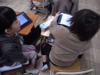 タブレットでクイズのカードを作り、友だちとクイズを出し合って楽しみました。