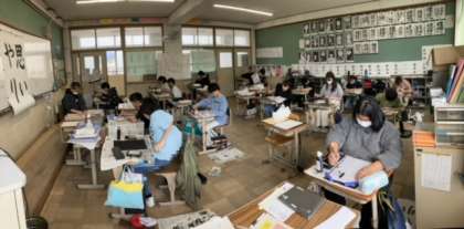 書写では「思いやり」という4文字を書きました。文字数が多くなると,バランスが難しくなります。お手本を見て,丁寧に書きました。