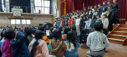 今日は,6年生を送る会の本番。ずっと練習してきた「みんながいるから」の歌を元気いっぱい歌うことができました。「すごくうまく歌えた!」と大満足の子どもたちでした。他の学年の出し物にも興味津々。楽しんで見ていました。
