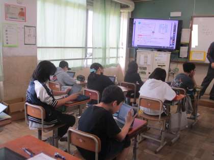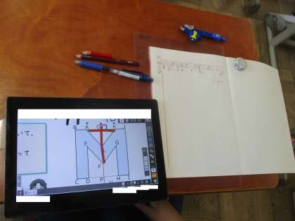 学習デジタル教科書を使って算数の学習をしていました。「コンパスを出してください。」という先生の指示に驚きながらも、コンパスのツールを使ってGIGA端末上で学習をしていました。とても楽しそうでした。