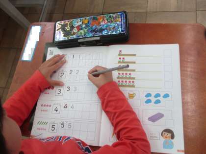 「1」や「2」などの数字の書き方の学習をしていました。一生懸命に書いて、がんばっていました。
