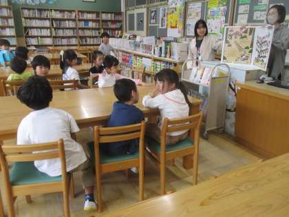 図書館に行って、本に親しみました。司書の先生に大型絵本も読んでもらったよ。