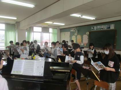 歌詞の表す情景を思い浮かべながら歌うことをめあてに、スクールサポーターの先生といっしょに歌っていました。