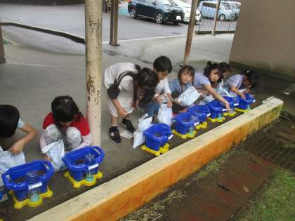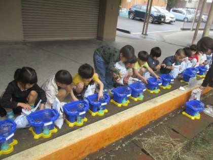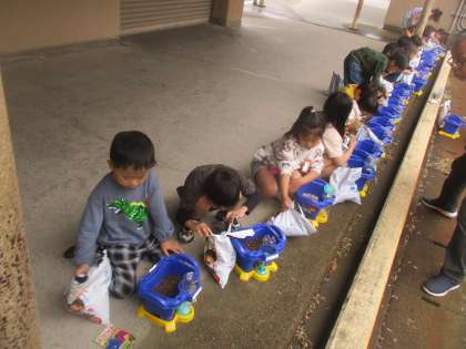 植木鉢に土を入れて、あさがおの種をまきました。もってきたペットボトルを使って、水やりもしました。ペットボトルのご準備ありがとうございました。