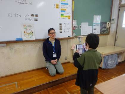 アプリを使って先生を撮影し、『先生の紹介カード』を作ります。