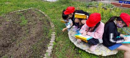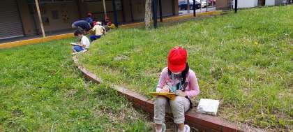 理科の学習で生き物を探しに中庭に出ました。今回は,1つの生き物をじっくり観察。虫眼鏡を使って,葉の形や花びらの形などをよく見て観察できました。