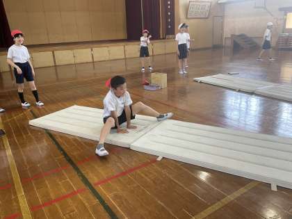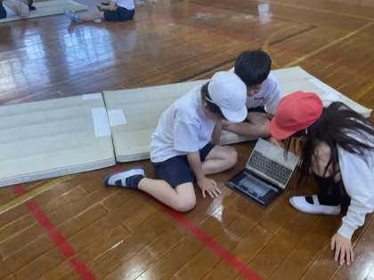 マット運動の学習がはじまりました。タブレットを使ってポイントを確かめたり,友だちとアドバイスし合ったりしながら進めていました!