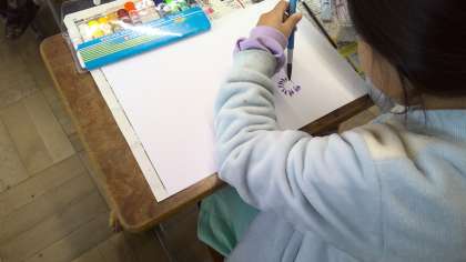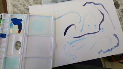 「この色とこの色を混ぜたらどうなるかな?」「筆の動かし方を工夫してみたよ。」「水の量を多くしたら少し色が変わったよ。」など,色々試しながら自分の「いいかんじ!」を見つけていました。