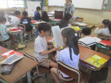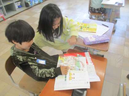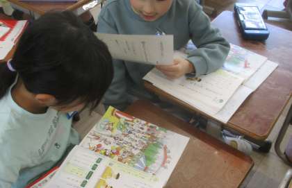 国語の学習の様子です。互いに問題を出し合いながら、楽しそうに話したり聞いたりしていました。