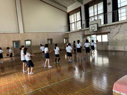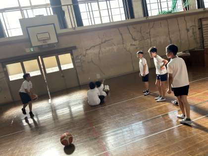 5年生はじめてのバスケットボール部の活動がありました。6年生の姿を見ながら声をかけあって練習していました。