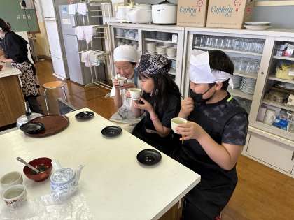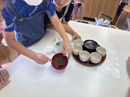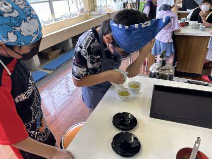 初の調理実習を行いました。相手を意識しながら,煎茶をいれていました。ほとんどのグループがおいしそうにできていました♪