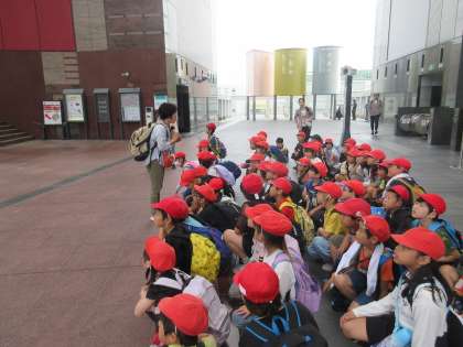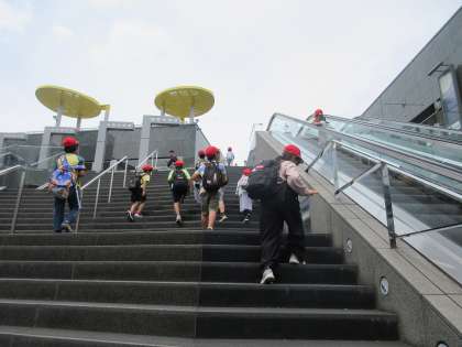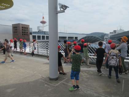 京都駅では,町の様子を観察しました。「人がいっぱいいる。」「建物が高いなあ。」「すごい,バスとかタクシーがいっぱい。」など,いいところに気づいていました。大階段にもたくさんの子が挑戦。上まで登り切った子もいました。