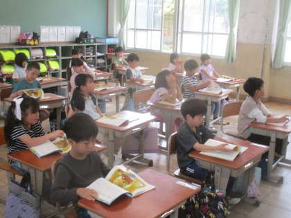担任の先生といっしょにお話の順序に気をつけながら読んでいました。