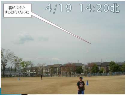 午後2時には雲の量が6ぐらいになり,うすい色で広がる大きな雲や少し灰色がかった大きな塊の雲が見られました。観察している10分ほどの間にも形や大きさが変わることが分かりました。