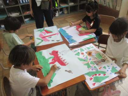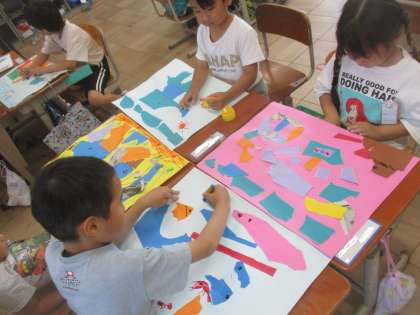 いろいろな紙をやぶいたりちぎったりして感じたことや想像したことから、表したいものを表現していました。