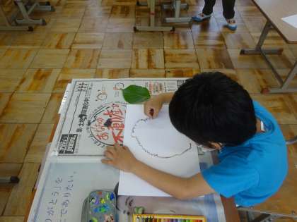 中庭の紫陽花の葉をもらい、よく観察して描きました。