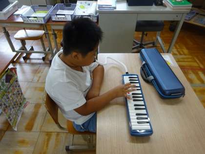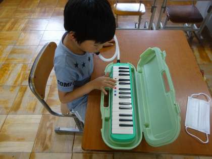 けんばんハーモニカで『メリーさんのひつじ』を弾いています。
