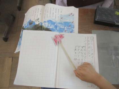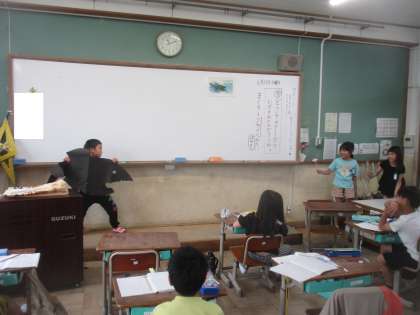 国語「スイミー」の学習の様子です。ミサイルみたいにつっこんできたマグロは、どんな速さだったのだろう?ペープサートを使いながら、例えを表す言葉に気をつけて読んでいました。