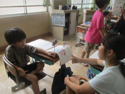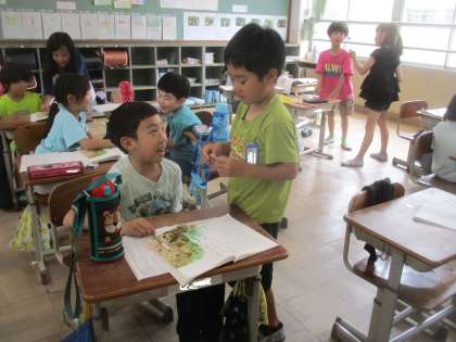 また、スイミーの学習の様子です。今日は、ペープサートをもって、ペアや小グループで話し合っていました。