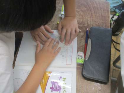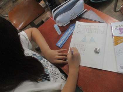 合同な三角形で、重なり合う辺や角はどこなのだろうか。分度器を使ったり、友だちと相談したりしながら、調べました。