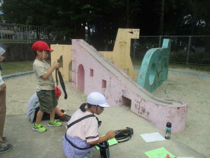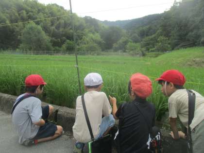 今日は、自分の行きたいところに行きました。今回は、田んぼ、畑、萱尾神社、日野児童公園グループの子どもたちが探検に出かけました。
