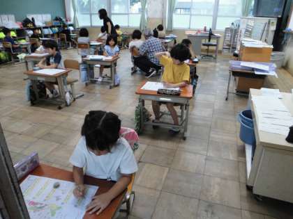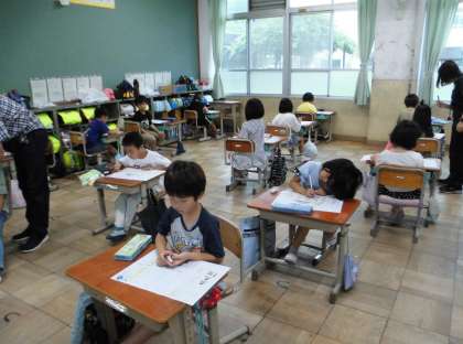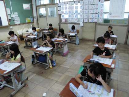 1年生がテストに挑戦していました。どうやってテストに答えるか、どんな態度でテストにのぞむかも学習していました。
