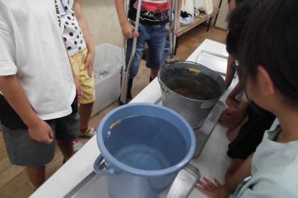 算数「かさ」の学習では、2つのバケツの水のかさを比べました。