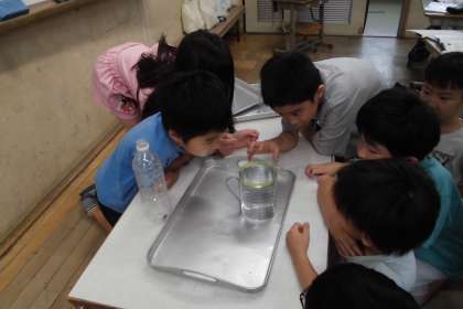 かさの単位も新しく知り、水のかさを予想したり、実際に測って目盛りをよんでみたりしています。