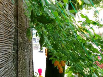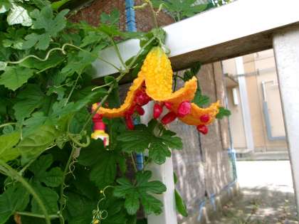 ゴーヤの実が割れて、中に赤いものが見えます。暑い夏休みをがんばって乗り越えてくれたゴーヤが、子どもたちにとって良い教材となっています。