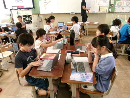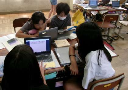 本のポップの内容を考えていました。ロイロノートを使って、友だちと交流していました。