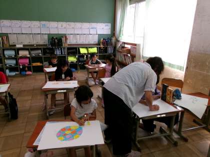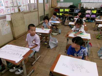 お話を絵にする学習をしていました。綿毛といっしょに飛んでいるうさぎが本当にタンポポになりたがっているみたいでした。