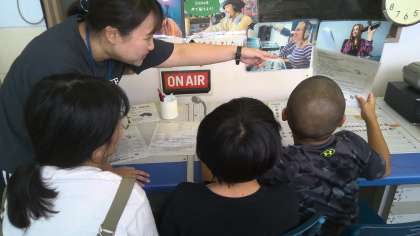たくさんのボタンのならぶ機械を前に,ラジオ局さながら