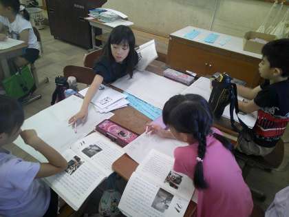 国語「どうぶつ園のじゅうい」では、獣医さんの仕事について、どうしてその仕事をしているのか、仕事をする上での工夫はどんなことなのか、調べたい仕事ごとに分かれて考えています。「工夫ってなんだろう。」「どんなこと書いた?」と調べたことをもとに、グループで相談し合って、解決しようとがんばっています。