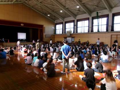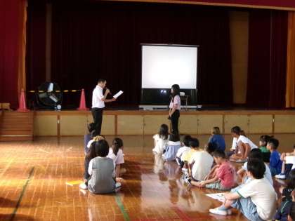 2学期始業式が体育館でできなかったため、今日の児童集会で表彰をしました。表彰を受ける人の名前が呼ばれ、代表者が賞状を受け取りました。