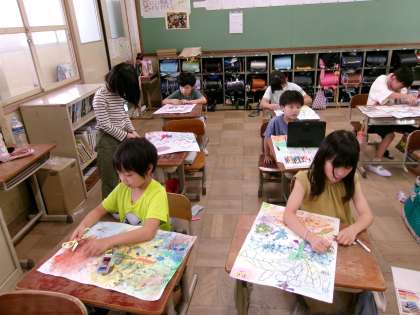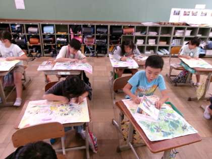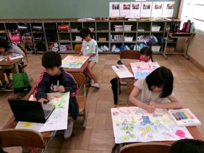 きれいに塗ることができた背景。その背景を大切にしながら、上から絵を描いたり、色をぬったりしていました。