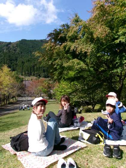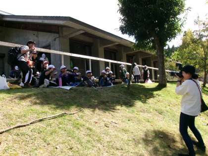 無事、山の家に到着。入所式をして、荷物を部屋に運び込んだ後は、お弁当。良い天気です。半袖で過ごせるくらいの気温です。到着が遅れたので、15分遅れで活動を始めます。みんな盛り上がっています。