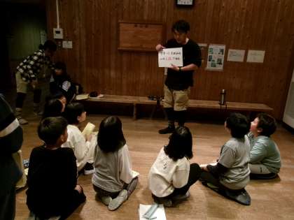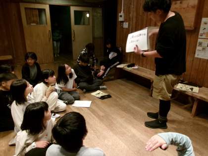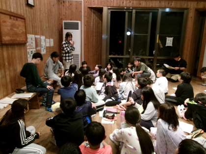 まずは、昨晩の様子です。寝る前にミーティングをしました。養護教諭から睡眠の大切さについて話をした後,リーダー会議をしました。班を率いてがんばっているリーダーにねぎらいの言葉とこれからがんばってほしいことの話をしました。